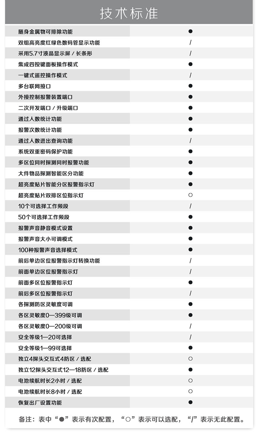 HC-TY300D金屬探測(cè)門(橫梁式)感應(yīng)快、探測(cè)準(zhǔn)、靈敏度高、抗干擾強(qiáng)、高穩(wěn)定性,電源設(shè)計(jì)在主機(jī)頂端,防水防潮,非常人性化;能滿足各行業(yè)用戶需求。此款安檢門嚴(yán)格執(zhí)行國(guó)家《GB15210-2003通過(guò)式金屬探測(cè)門技術(shù)通用技術(shù)規(guī)范》;